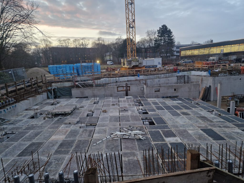 Ein Blick auf die aktuelle Entwicklung des neuen Lehrschwimmbeckens in Farmsen zeigt: Das Projekt nimmt sichtbar Gestalt an.